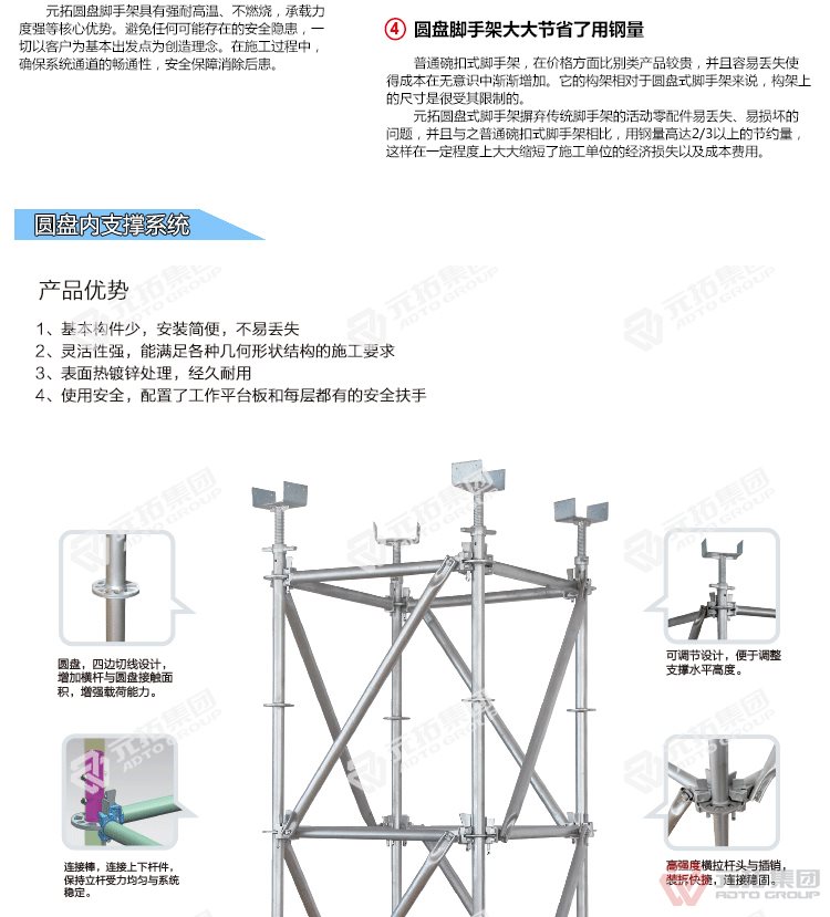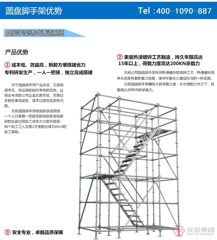 腳手架批發(fā)找元拓,天津和順昌是元拓集團(tuán)天津工廠直銷盤式腳手架,圓盤式腳手架具有基本構(gòu)件少、架設(shè)及拆卸作業(yè)方便、施工工效高、承載力強(qiáng)等特點(diǎn),被廣泛應(yīng)用于橋梁、隧道、電力、石化、造船、鐵路、機(jī)場(chǎng)、碼頭等工業(yè)及民用建筑的工程領(lǐng)域。相對(duì)于鋼管扣件式腳手架和碗扣式腳手架,圓盤腳手架有不可替代的優(yōu)勢(shì)。