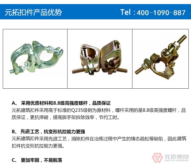直角扣件的使用方法:直角扣件用于腳手架鋼管的直接連接,選好連接位置,擰緊螺絲,扭力不小于40N;旋轉(zhuǎn)扣件用于腳手架鋼管的斜線連接及有角度連接,使用方法同直角扣件;對(duì)接扣件用于鋼管的直線連接,使用方法與上兩種相同.建筑扣件是在建筑施工中,搭建鋼管腳手架及鋼管結(jié)構(gòu)的臨時(shí)工棚,井架,模板支撐等作緊固連接用,有體積小,裝拆,運(yùn)輸方便,省物料等特點(diǎn).