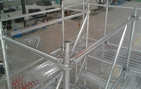 圓盤腳手架安裝方法是極快的,安裝時只需將橫桿接頭對準菊花盤位置,然后用手將插銷插入菊花盤孔并穿出接頭底部,再用手錘敲擊插銷頂部,使橫桿接頭上的圓弧面與立桿緊密結(jié)合。