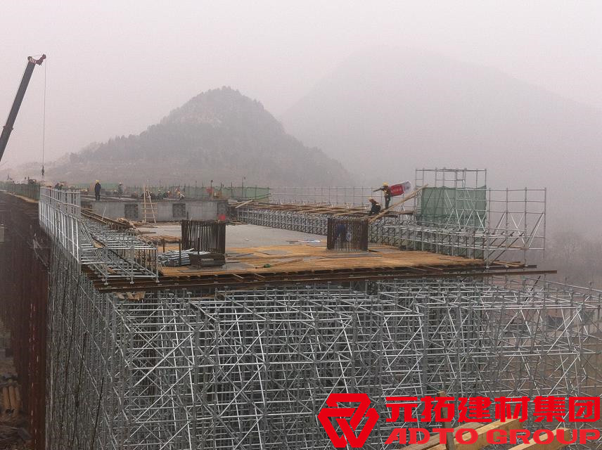 盤扣式腳手架主要構(gòu)件為立桿和橫桿,腳手架扣件連接點(diǎn)選用自鎖件聯(lián)接,具備靠譜的自鎖功能,構(gòu)造合理,立桿徑向傳力,使腳手架總體在三維空間確保它的總體可靠性,能較強(qiáng)的達(dá)到安全施工的要求。