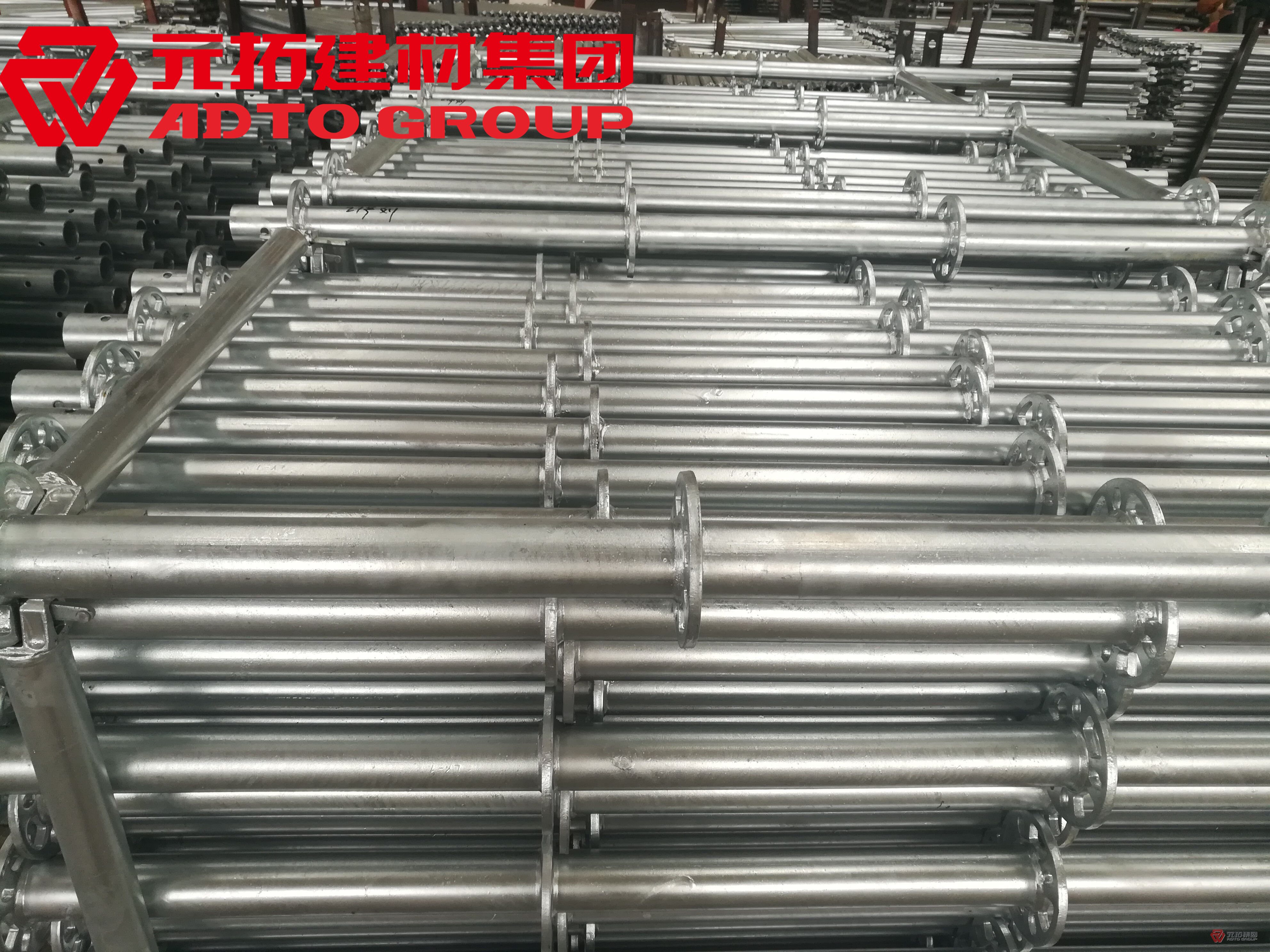 盤扣式腳手架也叫圓盤腳手架,主要構(gòu)件有:立桿、橫桿、斜拉桿、頂托、底座、腳手板、梯子等。是一種新型腳手架,廣泛用于樓宇、高架橋梁、地鐵隧道、廠房、舞臺搭建、室內(nèi)外裝修、大跨度建筑、各類水利工程、船體修造等。元拓腳手架生產(chǎn)的盤扣立桿產(chǎn)品是用低壓流體高強(qiáng)度焊管(∮60.3X3.2mm  ∮48.3X3.2mm ),通過全自動焊接設(shè)備(金獅焊機(jī))焊接而成,均使用Q355B低碳合金結(jié)構(gòu)鋼,整體穩(wěn)定強(qiáng)度比其他腳手架提高20%,產(chǎn)品表面采用內(nèi)外熱鍍浸鋅防腐工藝處理,提高了產(chǎn)品使用的時間,大氣美觀的銀色也為工程晉升了形象。目前國內(nèi)建筑行業(yè)迅速發(fā)展,特別是近幾年腳手架應(yīng)用的范圍優(yōu)勢,新技術(shù),新材料,新工藝不斷開發(fā)并被利用到建筑行業(yè),為建筑行業(yè)提供了更多的新鮮血液。